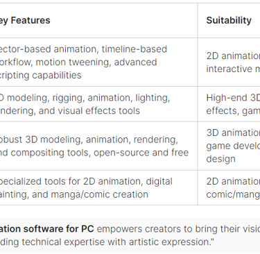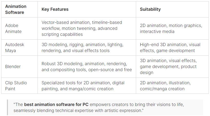 For 3D animation on PC, choose Autodesk Maya, Blender, and Cinema 4D. They have tools for creating digital worlds and characters, using motion capture and rigging to make animations live and breathe.